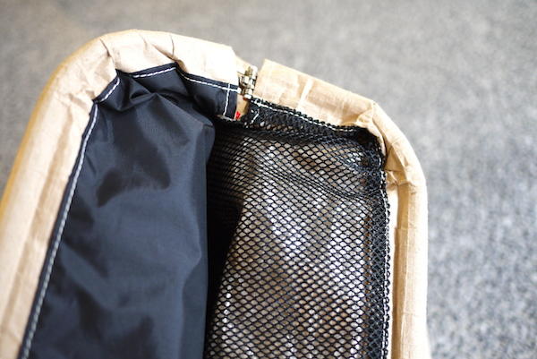 背包的主要材質如同剛才提過的,是以水泥沙袋相同的牛皮紙所製成,至於後背帶是縫上寬版尼龍背帶,耐重又舒適好背的特性使它雀屏中選,成為紙背包的好夥伴。整體長度為51公分,寬度則是35公分,肚子裡頭想放什麼東西都沒問題,筆記型電腦想一口氣放個三四台都難不倒它!(但會先難倒大家的肩膀~XD)