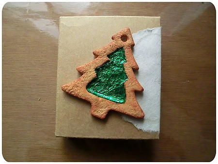 用餅乾模,或直接用刀切出聖誕樹形狀,邊緣再用菜瓜布輕拍出紋路,上端可以用吸管蓋出穿繩子的小圓洞