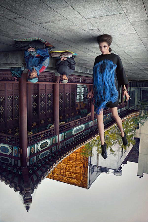 藉由顛倒的背景更凸顯出模特兒身上的華服,編者私自猜想這些模特兒應該是被鋼索吊掛著,因為可以看到背景的路人正用奇妙的眼神飄向模特兒,所以有可能(也不是很確定)不是電腦合成。還滿有趣的另一點是本篇文章的原始網頁,文章介紹文寫著這些照片到日本取景,但事實上很明顯的「香港燒臘」字樣就在背後的招牌中,也許對於不懂中文的老外來說,中文字與日文字相差不大吧...。這些作品會被刊載在英國知名時尚雜誌 Schön! Magazine 中。