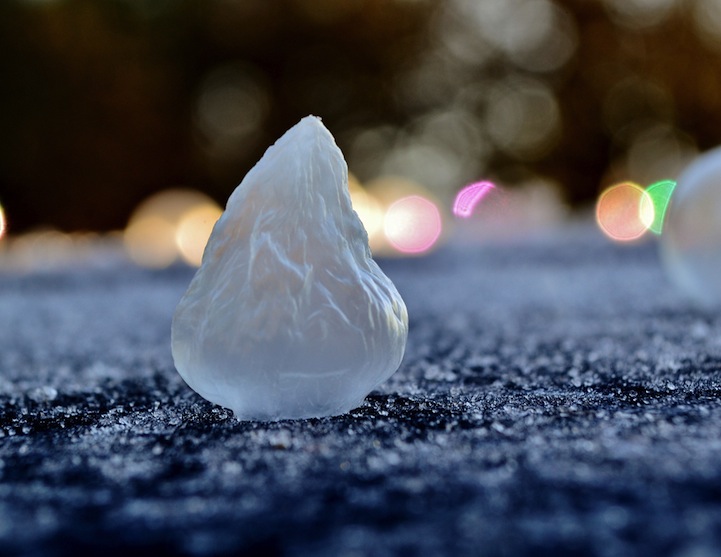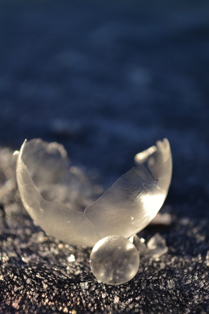 由肥皂泡泡結凍後的透明冰球,看起來既漂亮又脆弱,彷彿輕輕一碰就會碎裂,然而它也確實相當易碎,有些泡泡在落地經過撞擊後裂化或破碎,形成另一種美感,讓人屏息不已!