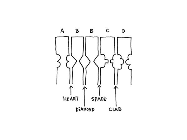 「Sukima」款式把筷子上方設計了雕空的形狀,設計了四種圖案,當兩支筷子放在一起時,中間雕空的形狀正好可以組合成撲克牌的四種圖案,當你隨機拿到兩雙筷子時,就能達到像是隨意抽撲克牌的效果,餐桌上的樂趣多更多。