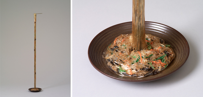 在這一碗碗「韓麵」裏頭,以綜合樹脂沏入一根根的麵條與各式拉麵佐料,眼望著舉得高高的麵條,與色彩鮮豔誘人的配料,彷彿訴盡韓國那淵遠流長的歷史文化,令人不由得注視得忘我,癡心地妄想一口塞進那滑潤的麵條入口。