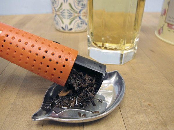 按壓泡茶器後方的按鈕,前方的茶匙就會順勢彈出,類似小畚箕造型的茶匙,在撈取茶葉時就不需要另外準備一個專屬的湯匙小勺子,這邊要注意的是選擇茶葉的葉片大小,像這次編者選的茶葉葉片比一般的小很多,所以就會有很多茶葉從孔洞中跑出來,但其實就像吃燒餅哪有不掉芝麻,喝茶不怕喝到茶渣,大不了下次選個大葉片的囉!(貼心提醒:撈取茶葉時請確定泡茶器是否乾燥,以免殘留水珠跑進茶葉中,造成茶葉發霉)