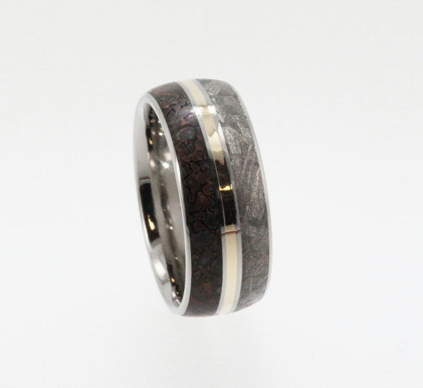 珠寶設計師 Johan 所推出的這款珍貴戒指,也許就是這些不崇尚名貴珠寶的女孩們可以挑選的樣式,乍看之下只有三層顏色不起眼的異材質拼接,但其實裡頭所用的材料非常特殊,深色帶橘藍色的是恐龍遺骨化石,銀灰色的部分則是隕石所製作而成,中間的金屬採用 14K 黃金;對於有點科學宅的人來說,隕石與恐龍化石能組合在一起,簡直就是個收藏的大好時機,更不用說能夠聊表自己與愛人間難得相遇的愛情有多麼彌足珍貴了!