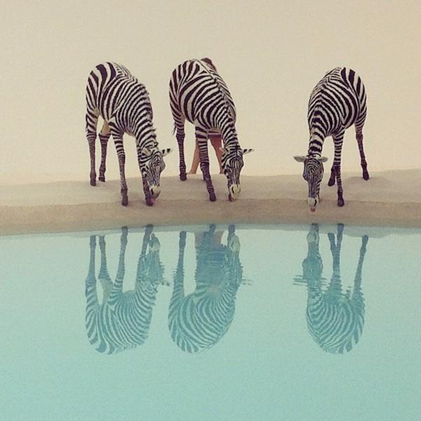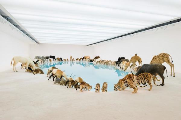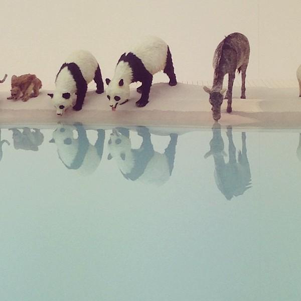 獅子、老虎、熊貓、羚羊、袋鼠,所有的動物們在這一刻沒有你我、沒有分歧,來自世界各地的他們都安靜的低頭飲水,其創作概念是希望呈現宗教般的肅穆和烏托邦的理想詩意。但美只是表面的,水面上同時也映著動物的倒影,就像海市蜃樓一般,他同時設計滴水裝置,使水聲打破寂靜,水面產生漣漪與波動,讓人們對於這樣畫面有更深層的思考。