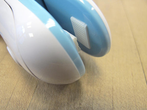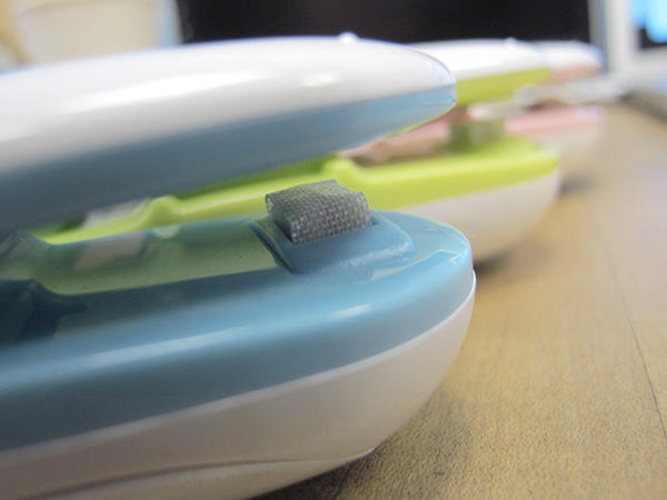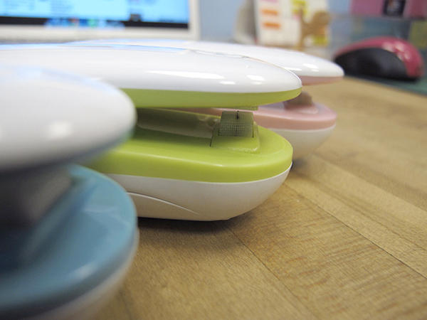 「Fanta Seal 開封趣」一共有三個顏色,機器本身呈現橢圓形,兩端都各有用途,仔細一看,兩邊各有著「+」與「-」的符號,「-」端夾口備有一個極小的銳利陶瓷刀,可以輕劃過就把塑膠袋割開,以後吃零食就不會重複上演打開包裝裡面餅乾飛光光的戲碼;「+」端則是加熱封口的熱融處,可以有效把開封後的零食密封,徹底阻絕空氣達到防潮。