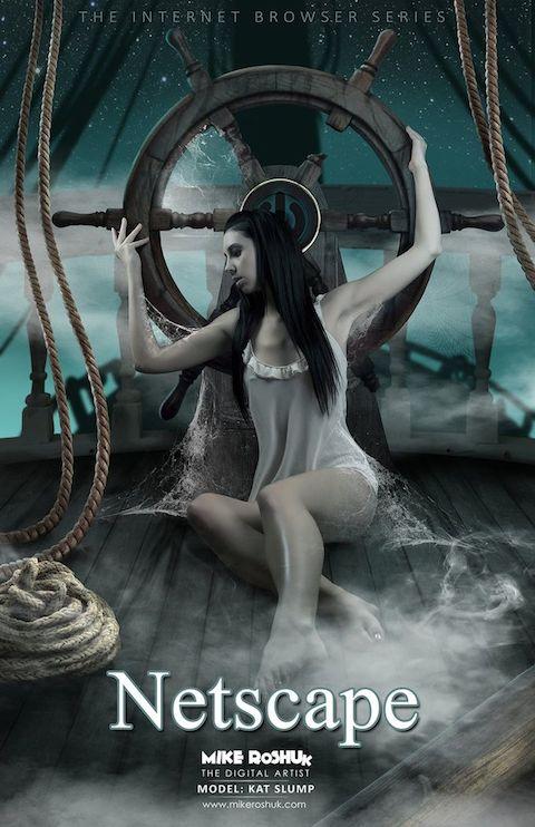 最經典的網路瀏覽器IE當然不能少掉藍色與與黃色線條的logo外觀特色,同時取其名稱Explorer的涵意,將模特兒打扮成一個探險者。在一切看起來都很美好的狀況下,Roshuk還是沒有忘記諷刺IE的優良傳統,在這系列的作品中唯獨替它加上象徵死當的藍幕做為副標題,同時做出不知道該怎麼辦的攤手姿勢,彷彿就在告訴大家:你問我為什麼會當掉,我也不知道啊~(攤手)