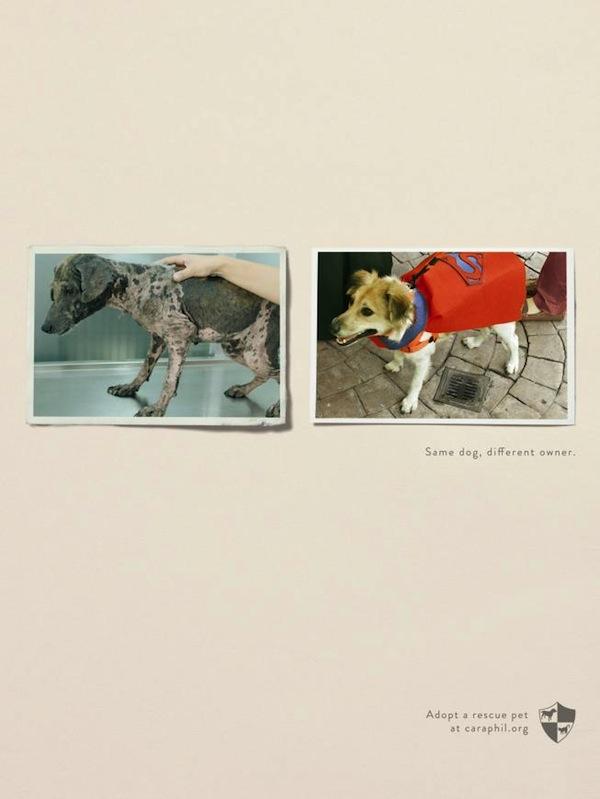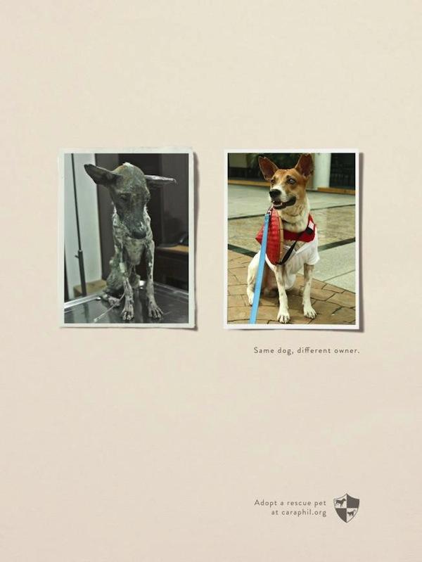 菲律賓的動物協會 CARA 與 TBWA 廣告公司合作,推出了一系列令人感動的海報設計,少了醒目的口號、繁瑣的文案,直接把收容所中的貓咪狗狗 Before 與 After 照片擺放在海報的中間,讓觀賞者可以一眼就感受到被領養前後完全不同的貓狗長相,藉此告訴大家,你所見的貓咪小狗剛流浪回來,真的不是他們該有的面貌,經過疼愛之後可愛度可不輸給那些純種的寵物們。