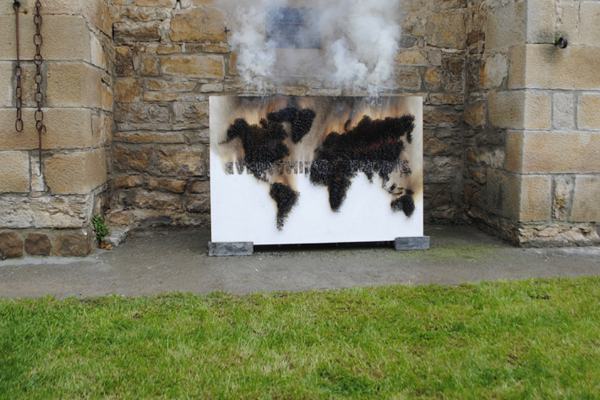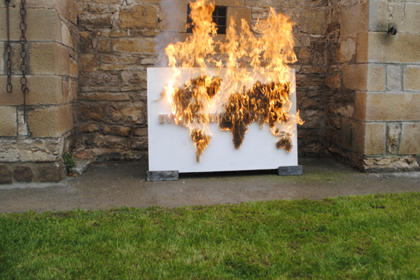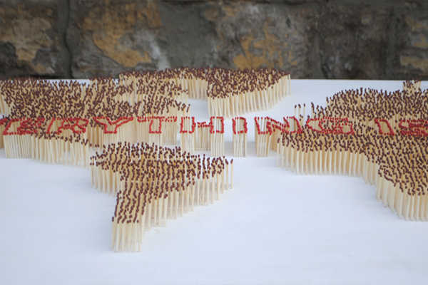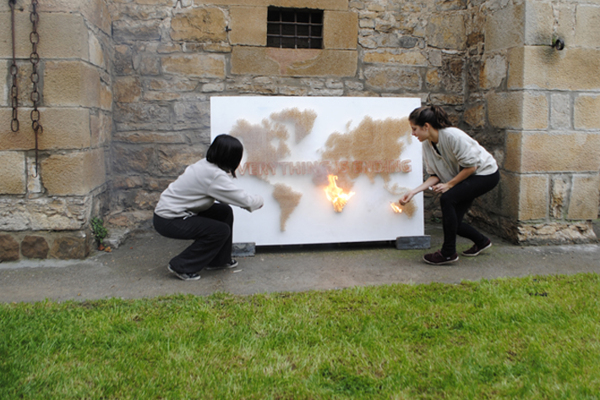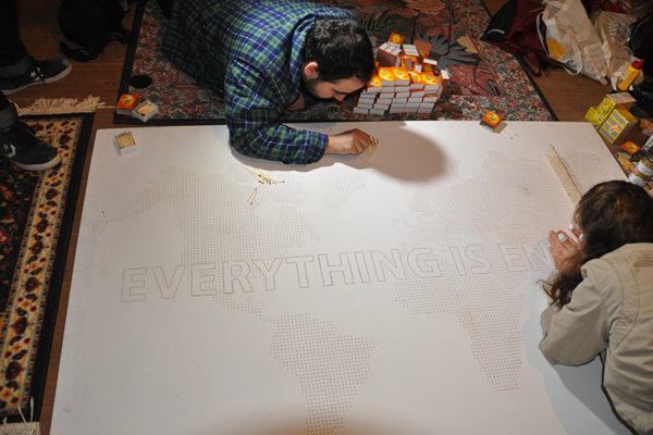 由 Javier Jabalera、Júlia Rosich 和 Pol Trias 齊力完成,先在板子上鑽孔,再將火柴棒依序安裝上去,他們準備了兩種顏色的火柴棒,用來區分圖型和文字,過程中不知道用掉了幾千根火柴棒,組裝完成後可清楚看到《EVERYTHING IS ENDING》字樣浮現在世界地圖中,這時作品的感覺頂多停留在"好像很費工"的程度,不過當澆過油、點火燒過一輪後,我們才能感受到真正想要表達的意思。