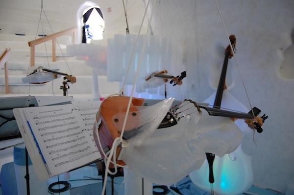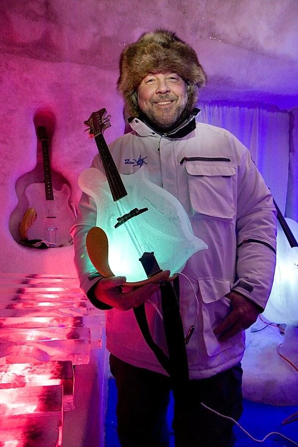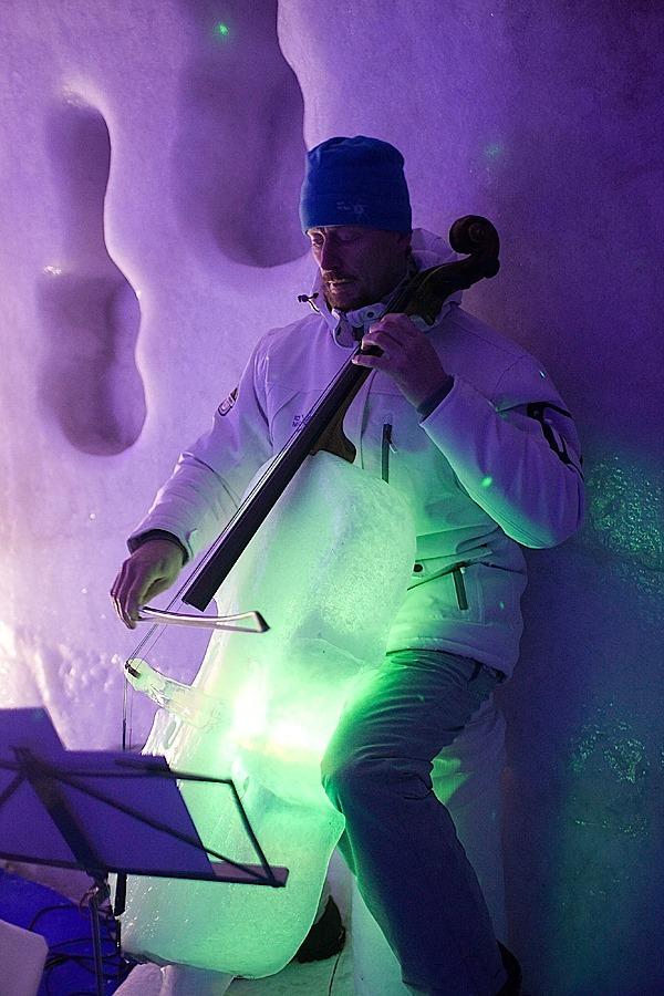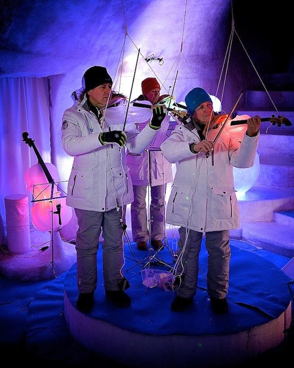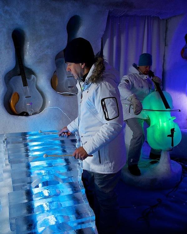 原來在音樂會裡頭的所有樂器都是利用冰塊所製成,巨大冰屋最主要的任務就是保持這些樂器不致融化,室內大約保持在華氏23度(攝氏-5度)的環境下,而且在牆壁上隨手一鑿就成了小型樂器最棒的保護盒,那畫面實在有些逗趣啊~表演中出現的樂器包括了低音大提琴、大、中、小提琴、班卓琴、曼陀林、吉他,還有冰製木琴(或許該稱之為冰琴)。樂器與冰雕都有涉獵的Linhart將自己的興趣與專長結合,玩出相當有特色的作品,而且還能藉此辦場表演來娛樂大家。