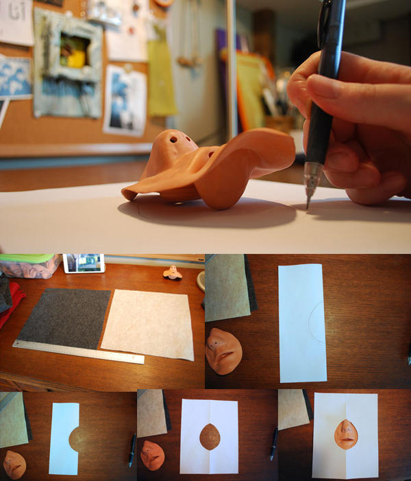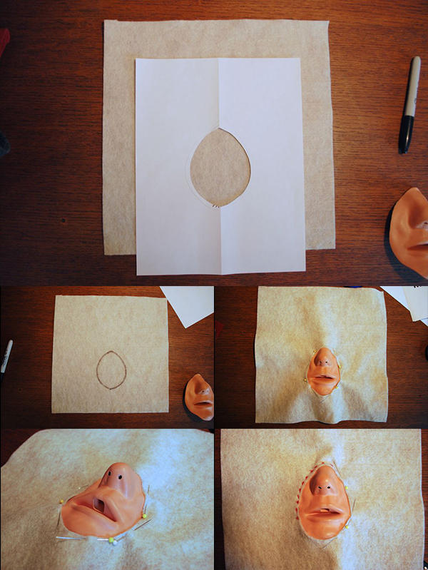 將假嘴巴的大小大約畫在紙張上,接著將紙張對折,沿著剛剛所畫的鉛筆線剪下,把紙打開後檢查一下是否可以把假嘴巴的周圍覆蓋住,確認嘴巴附近有留下縫份。