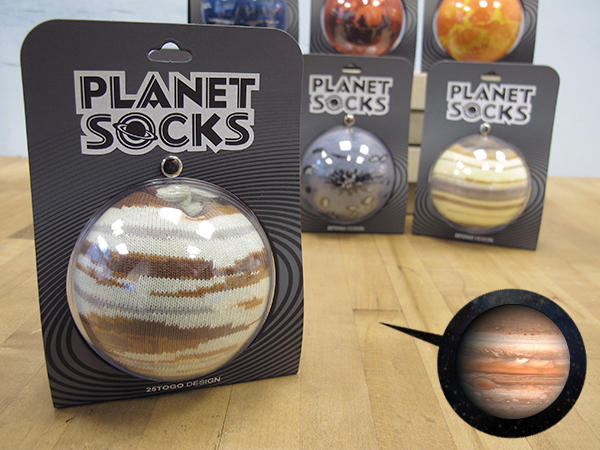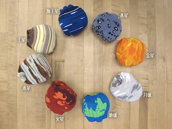 星球系列一共有七種款式,分別為水星、土星、木星、海王星、火星、金星和不算在九大行星內的月球,雖然九大行星漏了兩星,不過還是讓喜歡星球宇宙這些事物的朋友相當開心,畢竟一個禮拜可以每天都穿著星球襪子出門也滿足了宇宙迷的心願。最後一定要湊上地球系列的其中一顆,就算少了天王星、冥王星,也一定不能少了地球。