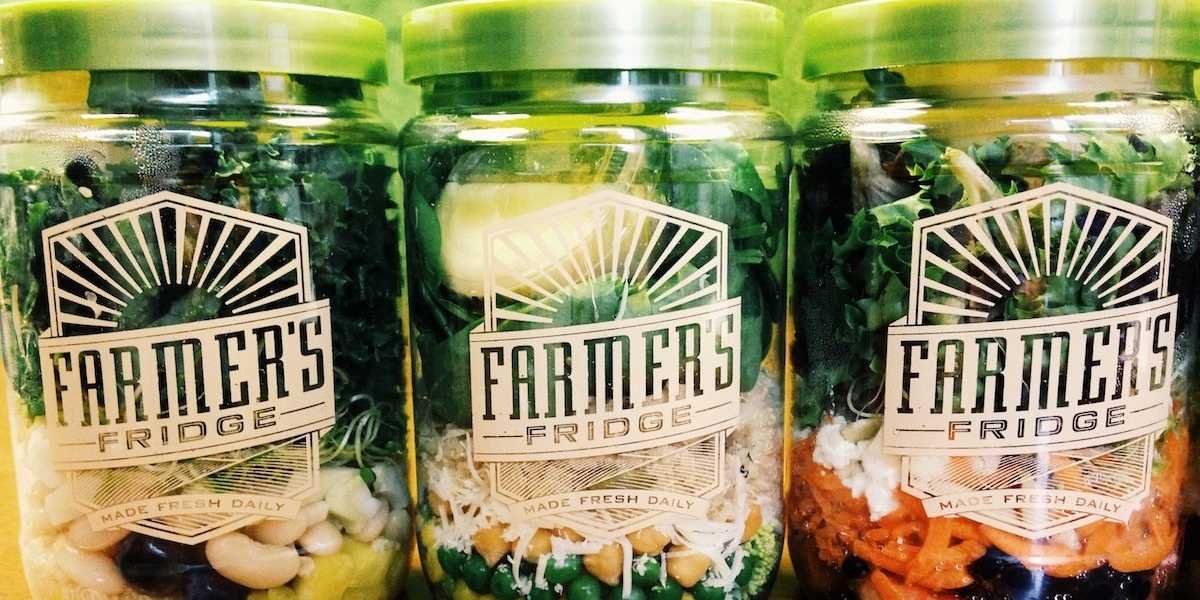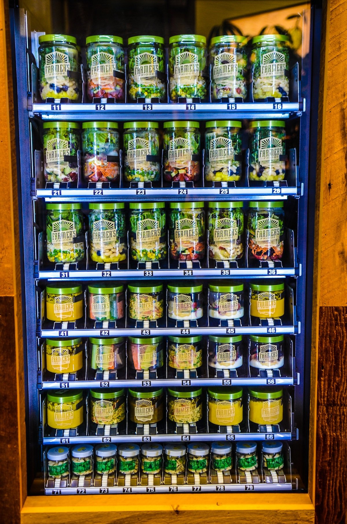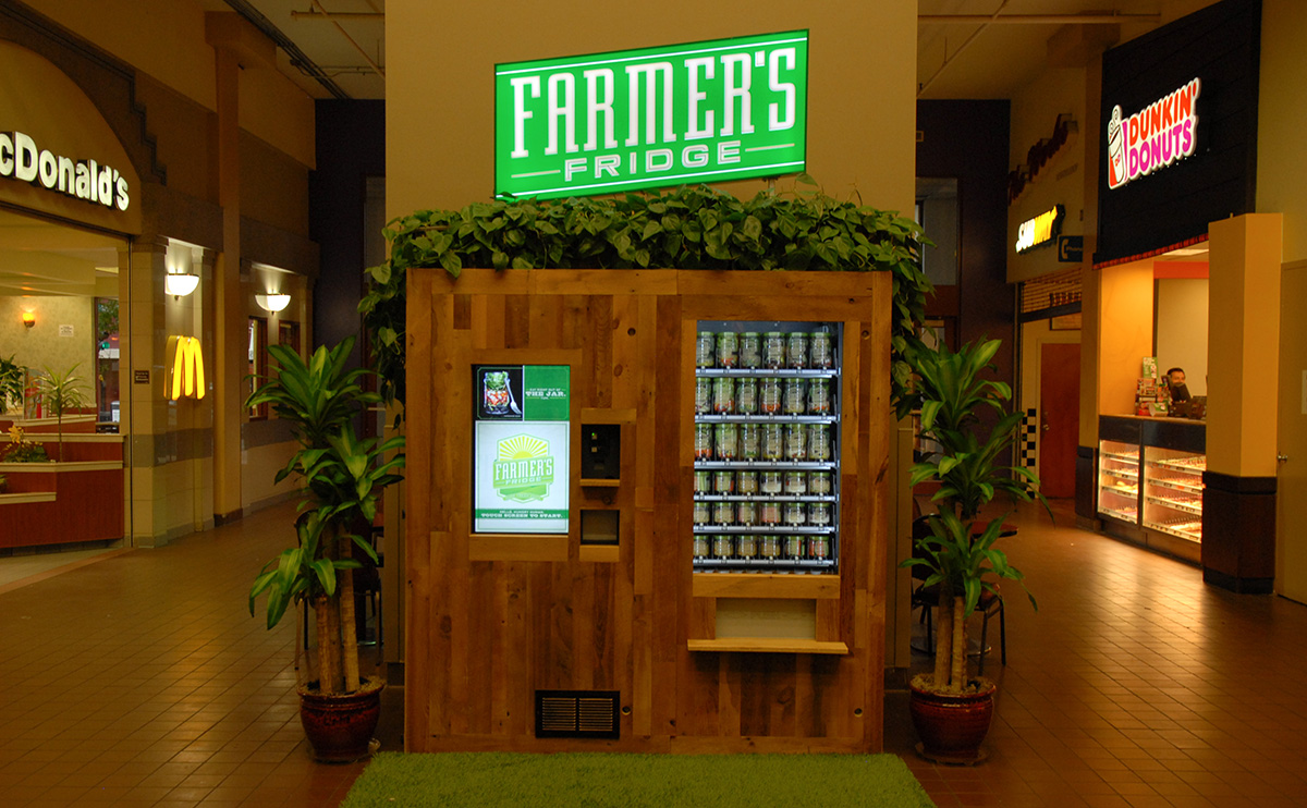 這台販賣機被他稱為「農夫的冰櫃」(Farmer's Fridge)。每天清晨,他會選用當地種植的蔬果配成沙拉,一層層將食材裝進玻璃罐中,最後再把罐子放入這台街邊自動販賣機,供民眾投幣購買。罐子中的食物疊放也有其學問,一定要把含水量多的水果擺在底層,再鋪上堅果,最後擺上綠色蔬菜和奶酪,才能確保食材不受傷,也能拉長保鮮期。