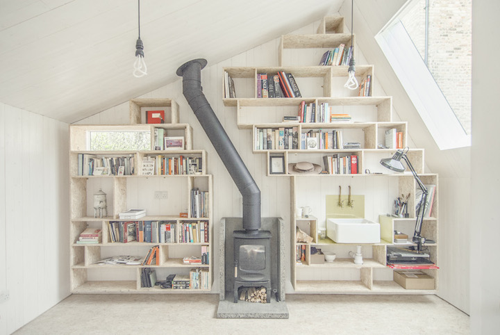 庭院小屋有個很有意思的名字,《Writer's Shed作家小屋》,這個名字相當適合它,淺白色的木板牆,採用傳統木材當燃料的壁爐,旁邊的書架隨興地隔出大小不一的收納空間,可以放書、一兩只下午茶壺、相框、或者是簡單的毛呢帽,如果剛好還有養貓咪,那牠應該也會在這書架上的某個隔間裡囉XD