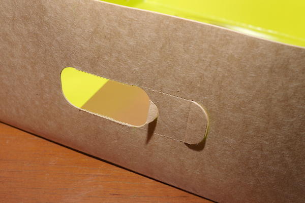 設計師的最後一個搞怪梗放在這塊突起的小紙板上,其主要用途是為了讓使用者在上方標註收納的物品為何,如此才不會導致收納容易,找東西卻是難上加難。至於收納盒旁邊還有特別設計的把手,只需沿著虛線撕下,就可以招喚出方便的把手,讓搬運收納盒變得更加簡單。