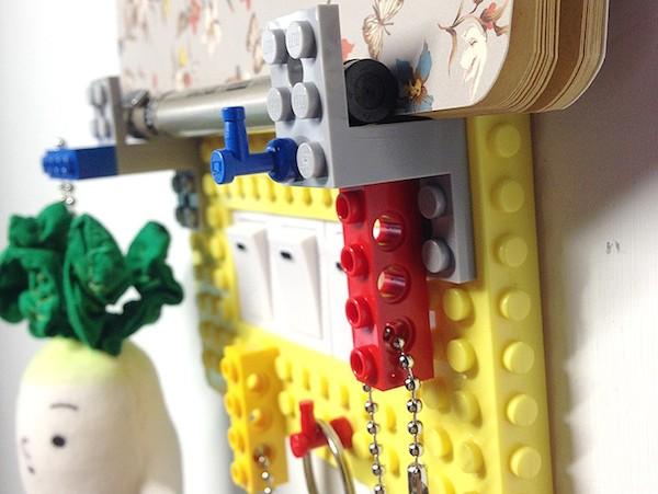 透過粘性十足的無痕膠條將Qubefun積木收納組固定在原本的電源蓋板上,五顏六色的積木板很能吸引大家的注意力,走過路過絕對不會錯過(這段聽起來怎麼很像夜市叫賣台詞~XD)。不過光是用顏色吸引是不夠的,一定要結合上大家對積木的共同回憶「樂高」才行。大家可以翻箱倒櫃把塵封已久的樂高積木拿出來創作,將其設計成一個個掛勾與平台,讓鑰匙、零錢袋、便條紙、名片等小東西放在上頭。