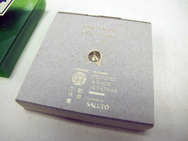 打開了綠色的半透明塑膠盒,裡頭灰色的厚卡紙中間懸著一顆徽章,看看正面背面都有燙金的 LOGO 和資訊,增加質感,徽章本人則撇除了一般別針的使用方式,採用的是後扣式設計,俗話說魔鬼藏在細節中,徽章的後方印有非常迷你的『一心一德』樣式,扣子上也印著《敬 你》的英文名稱 SALUTO,意思就是「行禮致敬」、「敬禮」的意思。