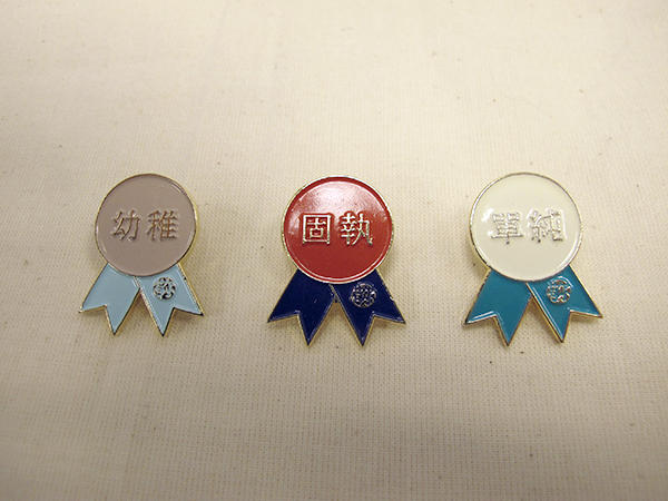 當然主角還是徽章上面的字句,如果你覺得你就像個長不大的資深孩子王,那就可以選購「幼稚」;要是覺得自己骨子裡就是個反骨小子,那「叛逆」就是你最好的選擇;想要像阿嬌一樣好傻好天真,那一定要佩戴「天真」才是;另外還有「念舊」(適合送給老是囤東西的老爸)、「體貼」(適合送會幫你拿包包的男友或是幫你冷飲與熱食分開放的早餐店老闆)、「勇敢」(可以送給敢徒手把蟑螂撕成兩半的老媽)、「誠實」(可以送給最近稱讚自己變漂亮的同事)、「固執」、「單純」等 9 款,隨喜送人自用都很適合!