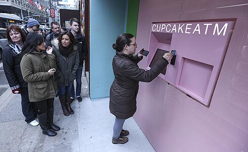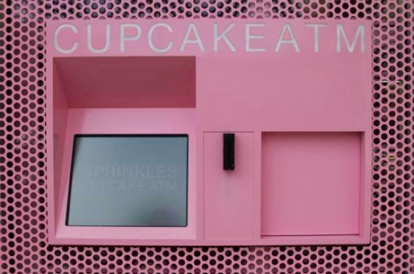 招牌是很有個性的黑底和彩色圈圈,但是販賣機本體的顏色卻是高調的夢幻粉紅,操作方式和ATM提款機一模一樣,以手指在螢幕上點選喜歡的口味和數量,因為這樣的販賣機相當奇特有趣,許多人都邊操作邊用手機拍照上傳到 Twitter 分享自己「提領」杯子蛋糕的過程,老實說還蠻吸引人的,而旁邊的實體分店也會固定幫 ATM補貨,儘量滿足所有辛苦排隊的紐約客們!