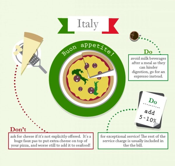 好吧,其實不管是說話還是吃飯都不能亂來,就連比劃手勢也要特別小心,以免自以為友善的舉動馬上變成挑釁的表現,英國 Restaurant Choice 網站以資訊圖表Infographic 的方式分析了一些國家的用餐習慣,以「Do 要」和「Don't 不該」來告訴大家一些小規則,包括該不該跟餐廳要調味料、小費怎麼給之類的,失禮就已經很不好意思了、萬一還惹到對方動怒那可不好處理了阿!