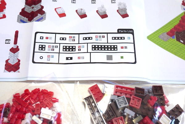 在東京鐵塔組合裡有四片綠色的大積木板做為支撐底部,兩袋積木們分別是四顆以上的大積木與一至三顆的零散小積木,顏色為紅黑白透明四色,單純不顯複雜,而且在配色上也相當舒服(私心覺得東京鐵塔比晴空塔有特色多了!。彩色的說明書讓大家可以清楚辨識,顏色的明暗則是代表已完成的步驟(暗)與現在所要組裝的部份(亮)。