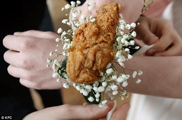 這束花並不一定要別在手上,只是當女生的身上帶了項鍊,或是不想遮蓋禮服細節時,便會把花繫在手上;KFC 肯德基趁著畢業季剛開始時,推出了令所有減肥已久的女孩瘋狂的產品:「炸雞腕花」,這項於 4/9 推出了新活動,已經接了將近 50 筆訂單,當下訂後只要憑收據,就可以兌換當天現炸的炸雞花,幸運一點還可以選擇原味、辣味的還是烤雞口味,讓當天飢腸轆轆的女孩們可以藉機止饑一下, 當場面尷尬的時候可以立刻開始大啃雞腿 。