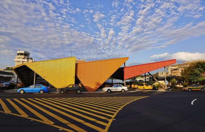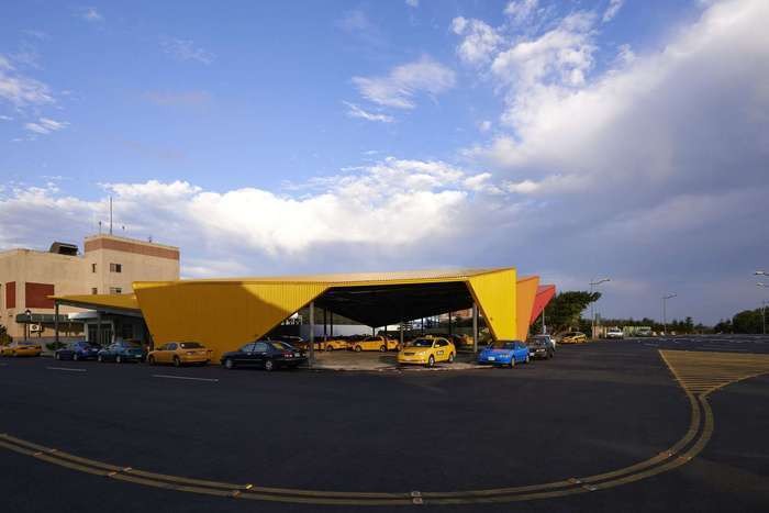 馬公機場計程車鋼棚的棚狀設計,有助於減少建材使用,進而達到「低碳澎湖」的概念;層次分割的棚型與利用彩色鋼板,不僅塑造成有如帆船般的海島形象,其造型一樣能達到阻擋西曬和東北季風的侵擾。(Photo credit:CCL Architects & Planners)