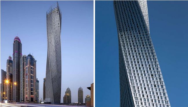 由建造「世界第一高樓」哈里發塔團隊 Skidmore, Owings & Merrill(SOM)操刀,於去年落成的「世界最高扭曲塔」──Cayan Tower,高達 307 米,還有著整整扭曲 90 度、酷似人體 DNA 雙螺旋結構基因的外型。這麼顯眼的大樓,無怪乎落成後成為阿聯杜拜的新人氣地標。(Photo credit:SOM)