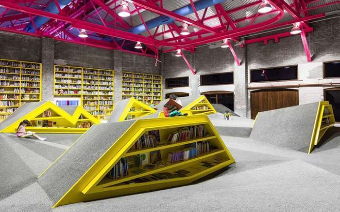 位於墨西哥蒙特雷(Monterrey)的「Conarte」兒童圖書館,設計團隊「Anagrama」參考蒙特雷多山崎嶇的地形,奇趣的山坡狀造型,凸出的部份作為一個個書架設計,其它高低起伏區則可讓兒童自由席地而坐,並以鮮豔活潑的顏色主視覺增加小朋友願意停留的時間。多面向的顯眼設計,讓這座圖書館能以完勝之姿,擊敗伯明罕市立圖書館(Library of Birmingham)及眾多高水準圖書館建築。(Photo credit:Anagrama)
