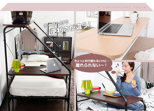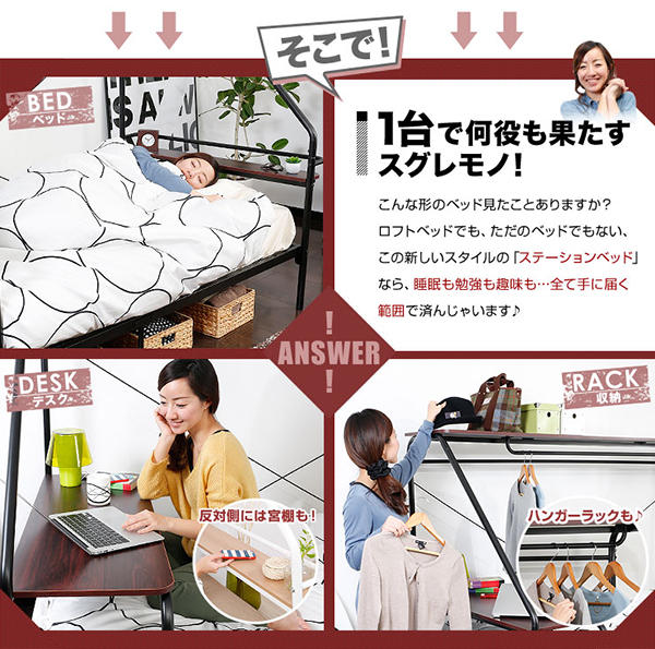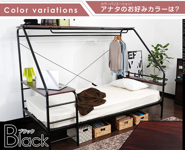 這張被戲稱為“Bed Station”的床架,猛一看就像是一般大學宿舍會有的上下鋪設計,只不過這張床架將上方的床鋪設計得更輕巧,僅能置物的大小,睡在下面就不會有壓迫感,加上床頭後方添加的超迷你型床頭架與床後方的小桌子,睡醒、坐起、立刻打開電腦上網的動作變得一氣呵成,光是這樣還不夠格稱為神器,這張床鋪還加上了臨時衣櫃,以及插座的功能,完全集床鋪、衣架、電腦桌、置物櫃於一身,耐重更達 100 公斤,如果你的預算真的不多,直接買這張就夠了嘛!
