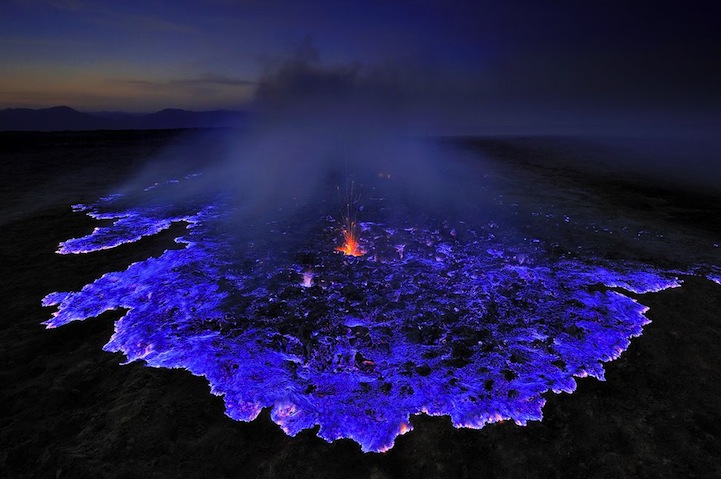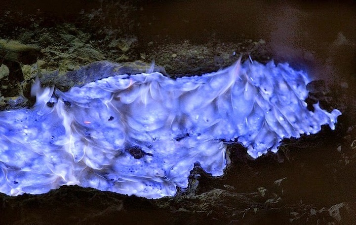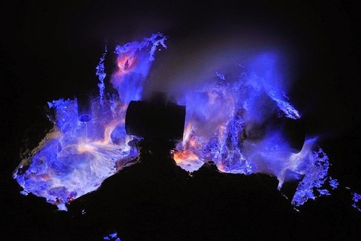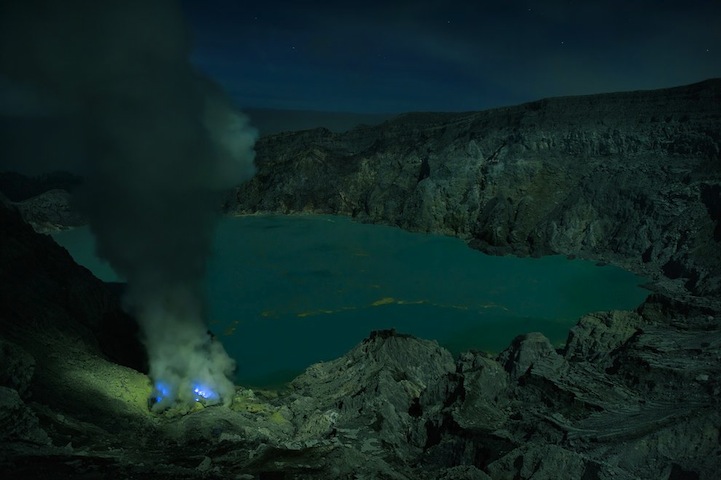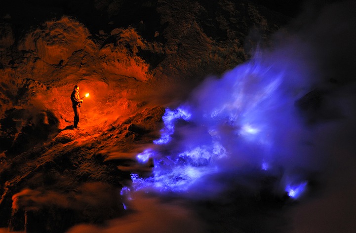 特別是在印尼爪哇東部的火山 Kawah Ijen,Kawah Ijen 長年外洩硫磺氣,在華氏1000度(約攝氏538度)的高溫中,延著火山裂縫蔓延而出,與空氣混合後,噴發出16英呎高的火花和火焰。有些燃燒的氣體經過壓縮後成為液體,散發出迷幻的藍色光芒,汩汩流出,被Grunewald幸運的捕捉下來,成為一系列的攝影作品。