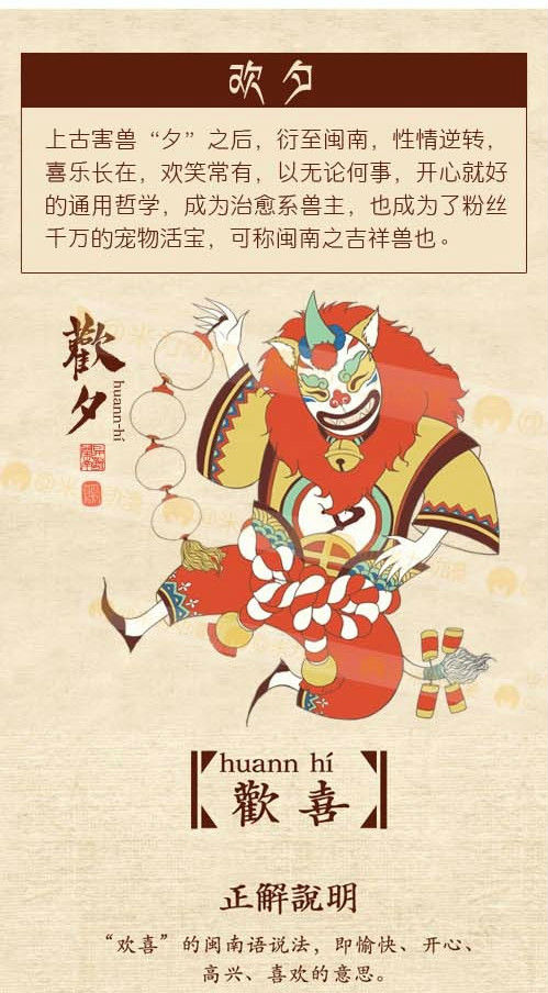 上古害獸「夕」之後,衍至閩南,性情逆轉,喜樂長在,歡笑常有。以無論何事,開心就好的通用哲學,成為治癒系獸主,也成為了粉絲千萬的寵物活寶,可稱閩南之吉祥獸也。