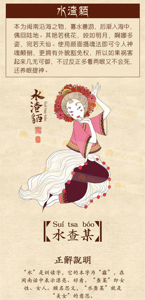 本為閩南沿海之物,喜水善游,後漸入海中,偶回陸地。其豔若桃花,姣如明月,婀娜多姿,宛若天仙。使用顏面攝魂法即可令人神魂顛倒,更擁有外貌豁免權,所以如果禍害起來幾無可禦,不過反正多看兩眼又不會死,還養眼提神。
