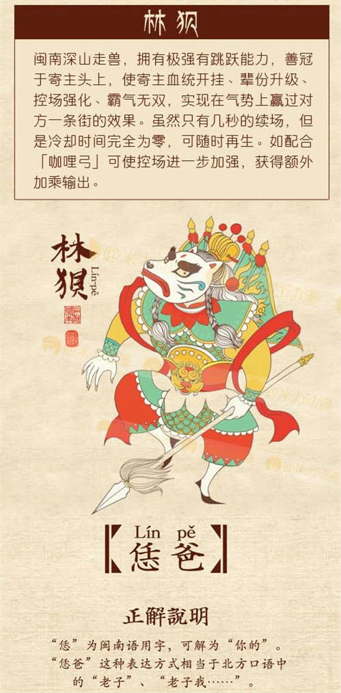 閩南深山走獸,擁有極強的跳躍能力,善冠於寄主頭上,使寄主血統開外掛、輩份升級、控場強化、霸氣無雙,實現在氣勢上贏過對方一條街的效果。雖然只有幾秒的續場,但是冷卻時間完全為零,可隨時再生。如配合「咖哩弓」可使控場進一步強化,獲得額外加成輸出。