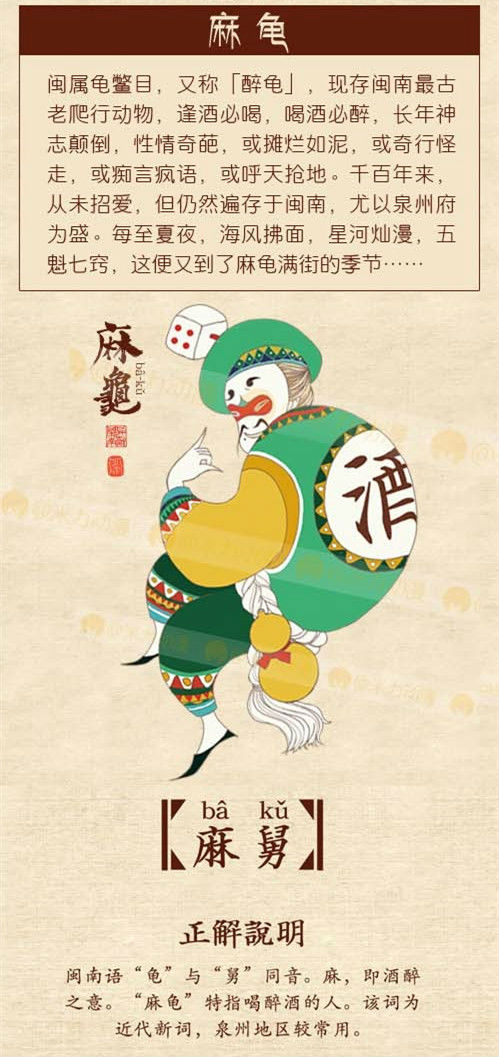 閔屬龜鱉目,又稱「醉龜」,現存閩南最古老爬行動物,逢酒必喝、喝酒必醉,長年神智顛倒,或癡言瘋語,或呼天搶地。千百年來,從未招愛,但仍然遍存於閩南,尤以泉州府為盛。每至夏夜,海風拂面,星河爛漫,五魁七竅,這便又到了麻龜滿街的季節。