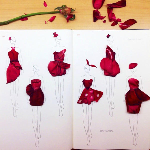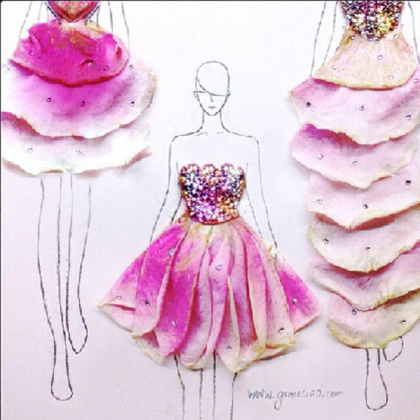 看過不少時裝插畫,除了利用色鉛筆、水彩筆之類的素材創作之外,也可以使用樹葉當作創作材料,而在新加坡有位插畫設計師 Grace Ciao ,把真正的花瓣加入了他的時裝插畫中,利用花瓣原生的美麗圖案,設計獨特的剪裁,美麗度甚至比真正的佯裝還要更吸引人目光,讓人不由得很想立刻催促設計師,請他把這系列服裝真正量產出來阿!