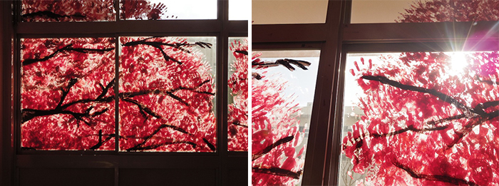 許多人一定疑問,他們是如何集體創作出這些美麗的櫻花呢?其實很簡單,走近一點看,原來那一瓣瓣遠看夢幻朦朧的櫻花,都是這些學生們的手印!