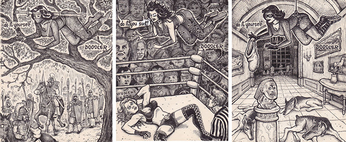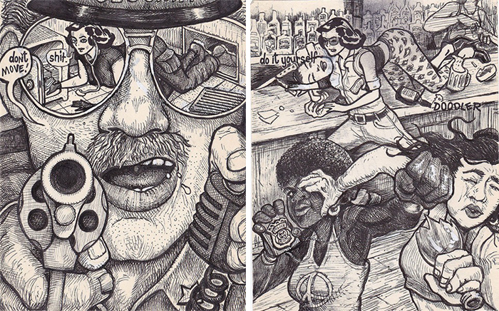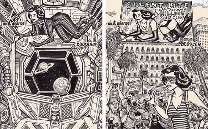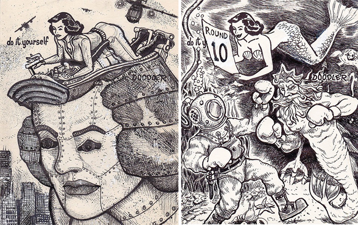 比起集思廣益的網路即興創作,David Jablow 的作品風格與創作筆觸當然顯得更有系列性與獨特性,甚至已經出版成冊變成書架上的作品集囉!誰說塗鴉很難獲得關注的,限制有時也能成為風格。這個版型若能在網絡上公開創作,相信又會產出一張張令人忍俊不已、拍案叫絕的有趣作品呢!