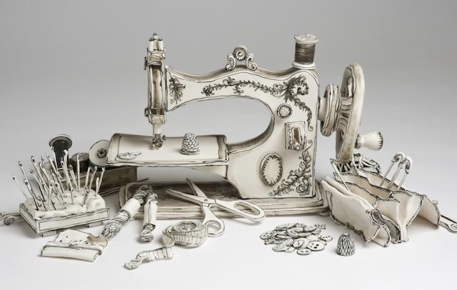 看這個純白的顏色與充滿插畫風格線條就知道,這台縫紉機與旁邊的用品應該都是由紙板所製成的,那立體感十足的作品就像真的物品一樣,讓人忍不住想摸一下~(伸手摸)。等等….不對喔~這個堅硬的感覺,敲下去還會發出清脆的響聲,原來這些作品不是紙啊!那它到底是什麼呢?