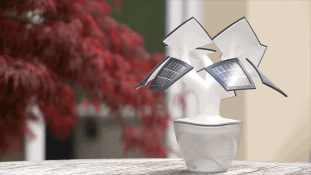 法國設計師 Vivien Muller 的巧思,將太陽能裝置結合盆栽,葉子就是太陽能板,指頭粗的莖部有可轉向設計,幫助太陽能板調整到向陽處,獲得的太陽能會轉化為電力儲存在底部的電池盒裡。