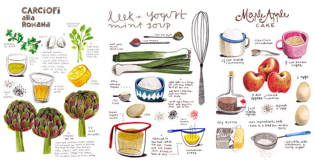 除了歐美人愛吃的家常菜之外,Felicita Sala 還繪製了許多異國風味料理食譜,像是 “泰式椰子魚湯”、“土耳其傳統醬汁 Tzatziki”、“澳洲釀魷魚”等等,與媽媽做菜的過程用手繪的方式記錄下來,不是只有繪製這麼簡單而已,還真正有紀念意義,也是實際可以製作出來的料理介紹。像這樣的風格真的會讓人越看越喜歡,就算不喜歡做菜的人,單純當作畫冊收集也十分有重複翻閱的意義。