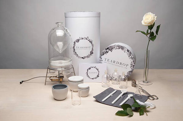 自己做香水有可能嗎?印象中電影香水的製造都要經過非常繁瑣的程序,肯定要準備一堆燒杯、酒精燈什麼的,於是義大利一間公司推出了一個品牌『Teardrop』,可以自己在家裡製作香水套裝組合,購買新鮮的花朵之後,將花瓣取下,裝入特別製作的蒸餾玻璃瓶中,放入冰塊,接著等水煮開,集合透過花瓣滴下的水珠後,再次隔水加熱,濃縮而成的精華,就是最新鮮的香水了。而且也不需要擔心市面上購買的產品是不是含有致敏成分,可以百分百自主管理成分內容。