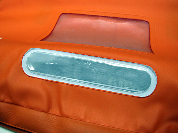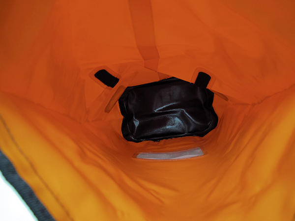 隨包附贈一個小小的網袋,採用 YKK 拉鏈設計,加上小袋子後方的魔鬼氈,可以與包包內部的兩條魔鬼氈相黏,解決了包包無內袋的問題。不過看來看去,怎麼都沒有看到包包的拉鏈或是蓋子呢?這款防水包使用的防水模式為 “捲摺式封口”,將黑色封口捏扁後往下折三折,在反口將扣環扣上,便可以讓包內呈現完全防水的效果,突然遇到暴雨或是浪花打過來時,都可以達到防水功能。
