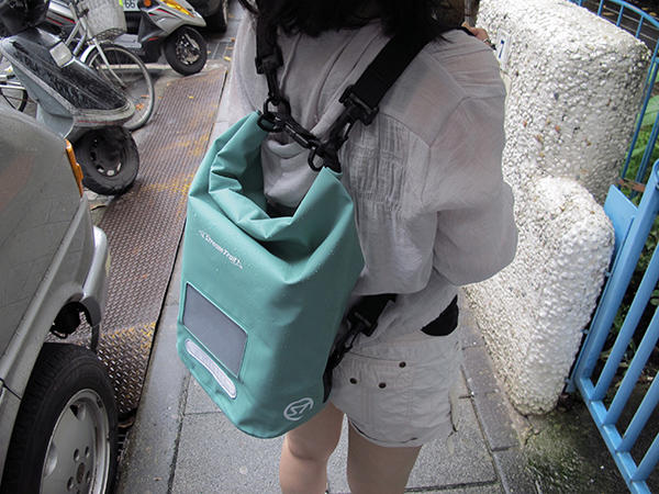 ▲加上兩條帶子後,當做後背包也不錯,而且再也不用擔心雨傘遮不到的地方會淋濕了。像這樣的三折是封口,出國旅行也不用擔心拉鏈忘了拉,或是遇到小偷扒手,當後面的人一打開扣環時,你一定會有感覺的啦!