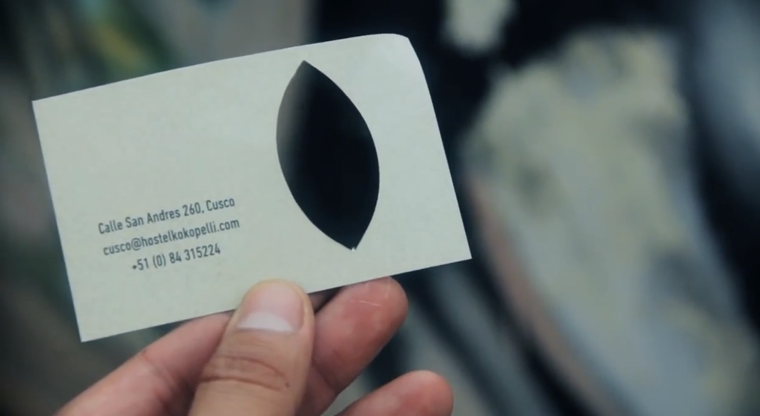 Kokopelli 位於 Cusco、靠近安地斯山脈,許多旅人會在此歇腳後,繼續攀爬高峰,而這張名片就是幫助旅人們登頂的寶物,內含古柯葉的成份,只要你開始有點高山症的不適感,就能快速送進口中咀嚼,以緩解症狀。這張名片中特地分隔出一片葉子的形狀,供旅人們取下食用,其他的地方則印有旅館的詳細位置和聯絡資訊,當旅人們登頂成功,準備打道回府時,可以按著資訊再次光臨旅店。
