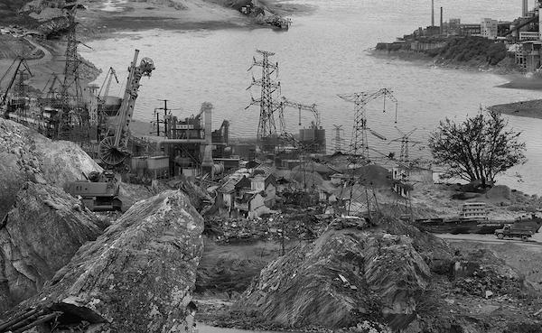 原來這幅看似傳統山水畫的作品並不是在讚頌山川的美麗,而是在控訴人類對於大自然的過度開發,當想要超過了需要,房子便一棟接一棟的蓋,電塔也一座座的矗立在各個山頭,密密麻麻的遍佈在所有角落。挖土機盡情的開挖,樹倒了、野獸散了、小鳥飛了,人類佔據了山,遍佈了河岸,這就是藝術家想像中的「新世界」。