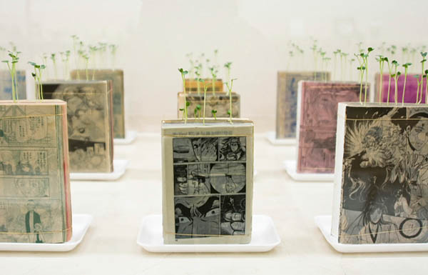 在河地貢士過去的作品中,向來不缺乏新奇的創意。擅長從現代生活中的日常物品取材,他曾經將我們童年愛不釋手的零嘴玉米棒雕刻成一尊尊人類雕像,這次的計畫,則起源於不少人的童年收藏──一本本厚重、泛黃的漫畫月刊。省去了沈重的花盆和土壤,他將一株株蘿蔔幼苗種植在漫畫月刊中自己最喜歡的一頁,讓抽高的綠色新芽,成為最自然的書籤,紙頁上的文字,則成為最佳肥料。盎然迸發的生機,讓古早漫畫人物泛黃的臉,重獲新生。