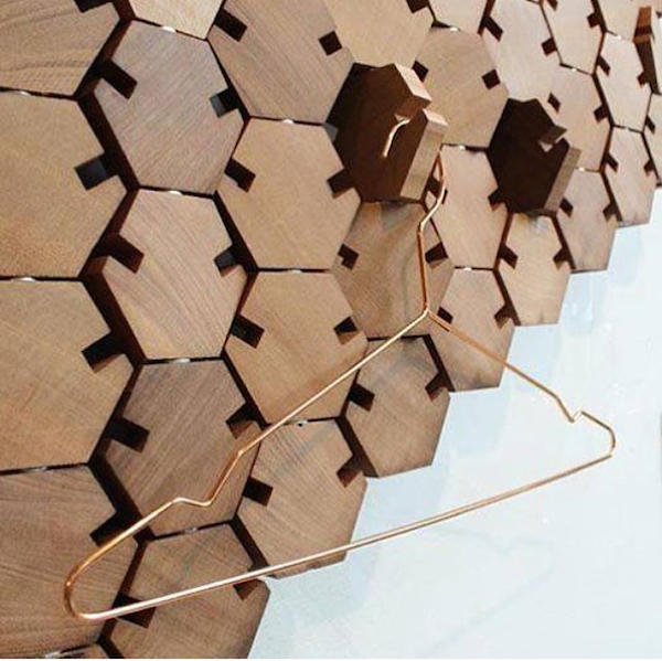 設計師選用木頭作為材料,衣帽架本體由眾多的六角形所組合而成,看起來就像個結構完整的蜂巢一般。重覆的幾何造型讓它能不斷的延伸,當消費者在購買時可以選擇所需要的大小,如果想用它來取代傳統的衣櫃也是沒問題。