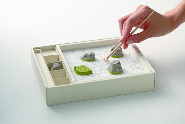 藝術總監 Tomonori Saito 與 Shohei Sawada,替和菓子師傅 Motohiro Inaba 設計了很獨特的和菓子包裝,打開盒子後,會看到一片空曠的迷你庭園,當中鋪滿了細碎砂糖,旁邊的微型芝麻味石頭和菓子正是包裝中的主角,利用盒中附贈的可愛小木耙,慢慢的在砂糖上畫出規則的紋路線,就完成了甜滋滋的日式甜蜜花園。