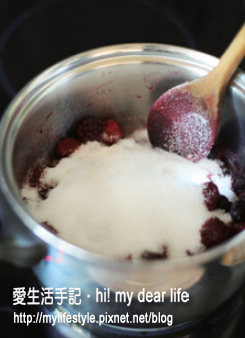 2、放入糖,有時翻攪一下莓果,繼續慢火燉個10分鐘。